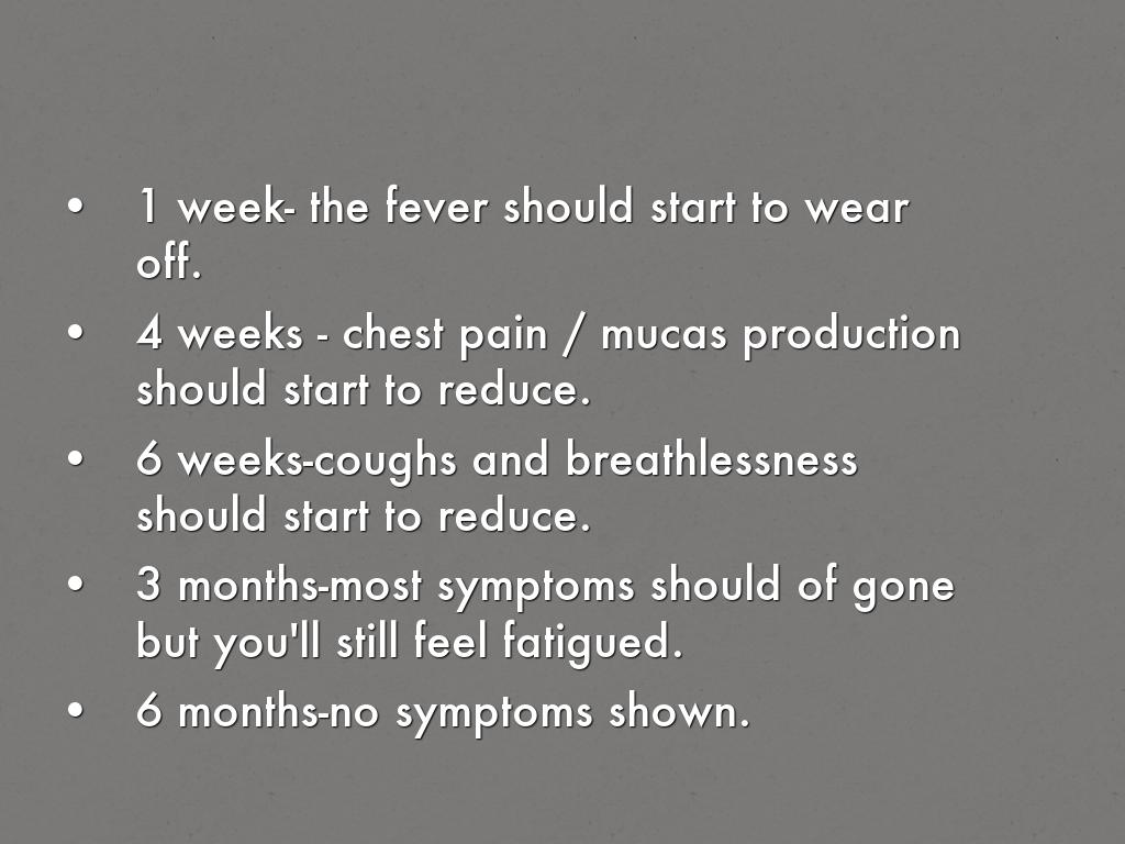 3 months-most symptoms should of gone but you'll still feel fatigued.