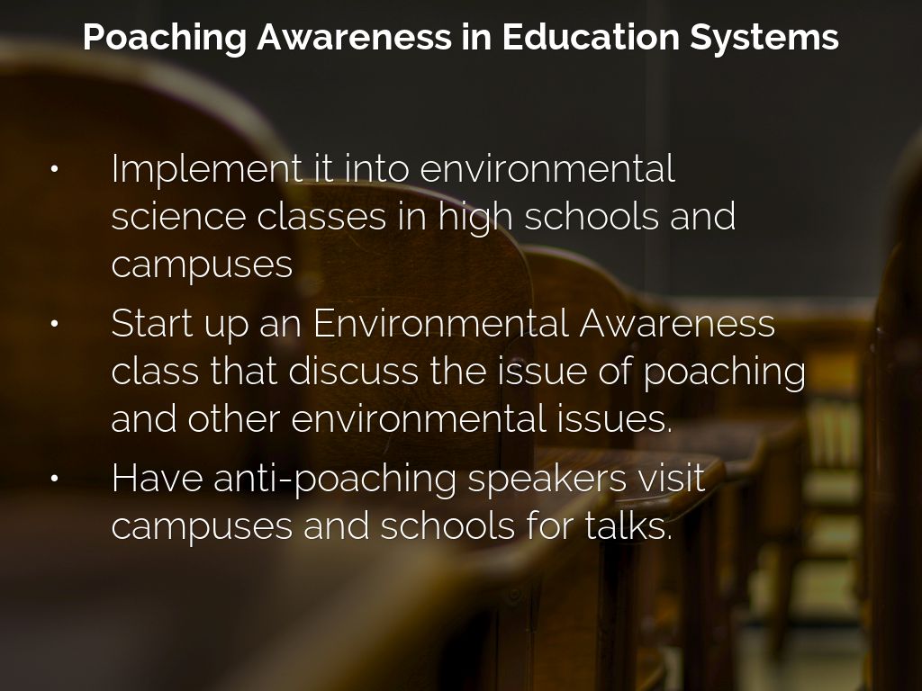 Public awareness will encourage more people to become activists against poaching and convince others never to take part in it.