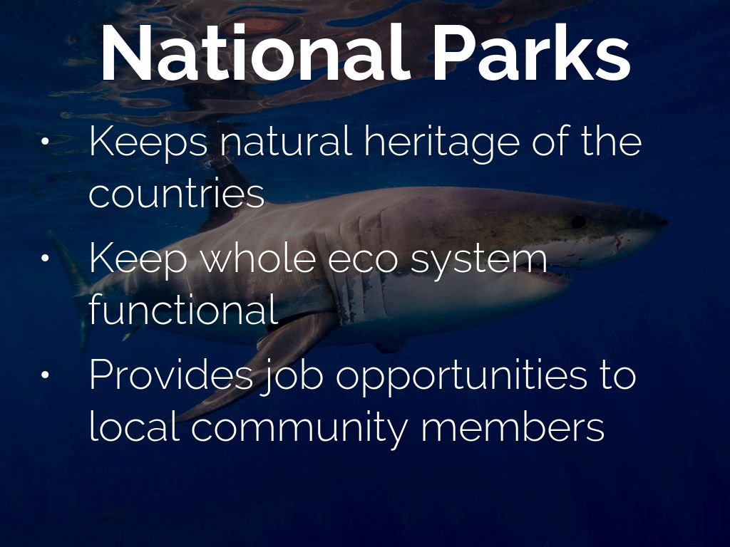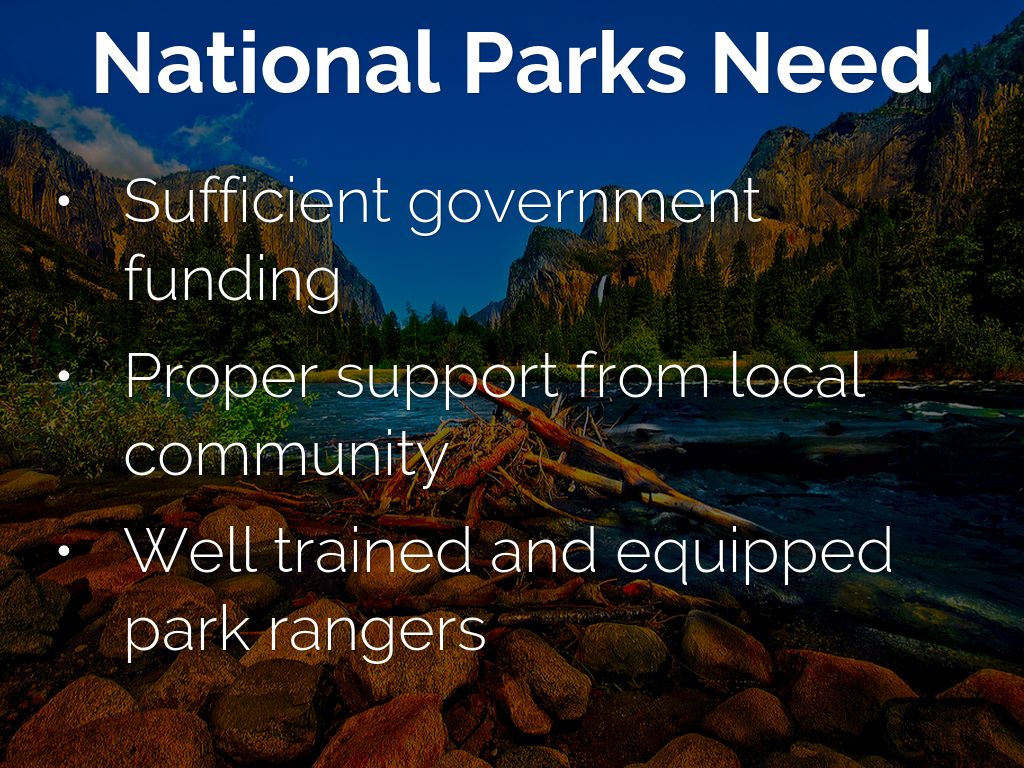 Improving national parks will give animals a better area of land where they can be protected and preserve the ecosystems of the countries.