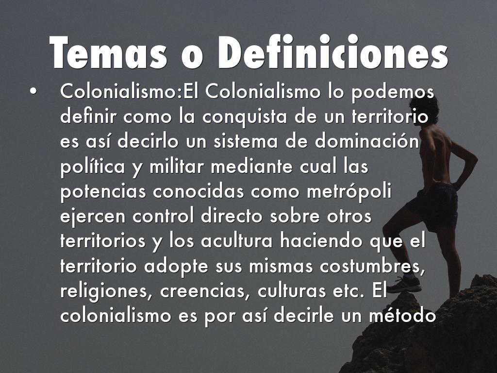 Colonialismo:El Colonialismo lo podemos definir como la conquista de un territorio es así decirlo un sistema de dominación política y militar mediante cual las potencias conocidas como metrópoli ejercen control directo sobre otros territorios y los acultura haciendo que el territorio adopte sus mismas costumbres, religiones, creencias, culturas etc. El colonialismo es por así decirle un método que conquista y acultura diferentes territorios por medio de la conquista ejerciendo un poder directamente.