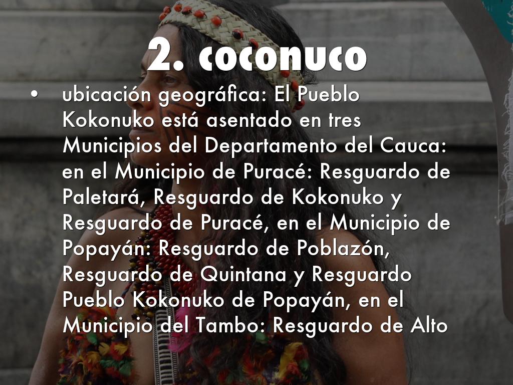 ubicación geográfica: El Pueblo Kokonuko está asentado en tres Municipios del Departamento del Cauca: en el Municipio de Puracé: Resguardo de Paletará, Resguardo de Kokonuko y Resguardo de Puracé, en el Municipio de Popayán: Resguardo de Poblazón, Resguardo de Quintana y Resguardo Pueblo Kokonuko de Popayán, en el Municipio del Tambo: Resguardo de Alto del Rey y el Cabildo de Guarapamba y además aquellos cabildos o resguardos que por su identidad cultural y mediante un proceso de reconocimiento harán parte del pueblo Kokonuko.