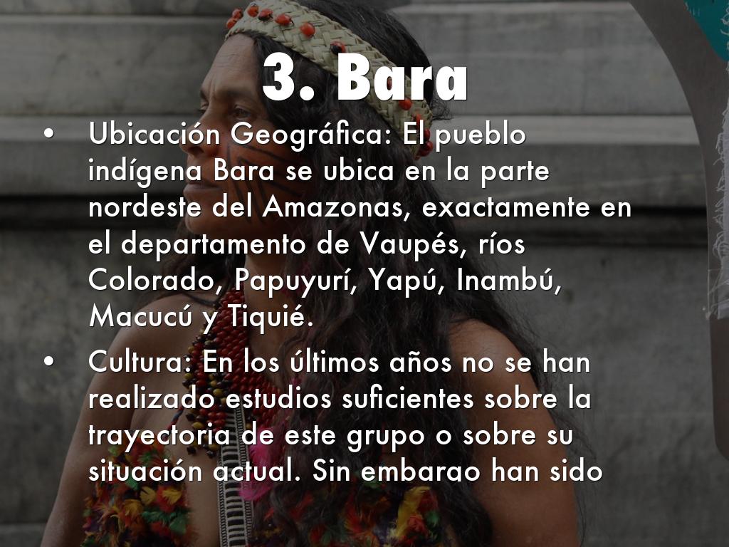 Ubicación Geográfica: El pueblo indígena Bara se ubica en la parte nordeste del Amazonas, exactamente en el departamento de Vaupés, ríos Colorado, Papuyurí, Yapú, Inambú, Macucú y Tiquié.