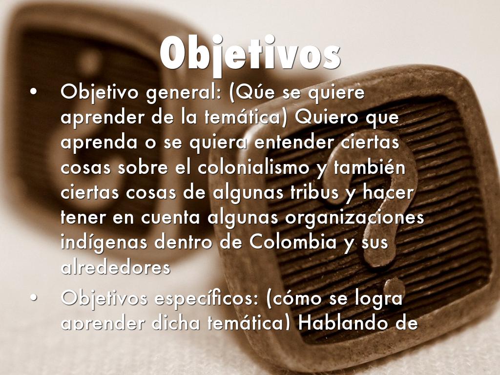 Objetivo general: (Qúe se quiere aprender de la temática) Quiero que aprenda o se quiera entender ciertas cosas sobre el colonialismo y también ciertas cosas de algunas tribus y hacer tener en cuenta algunas organizaciones indígenas dentro de Colombia y sus alrededores
