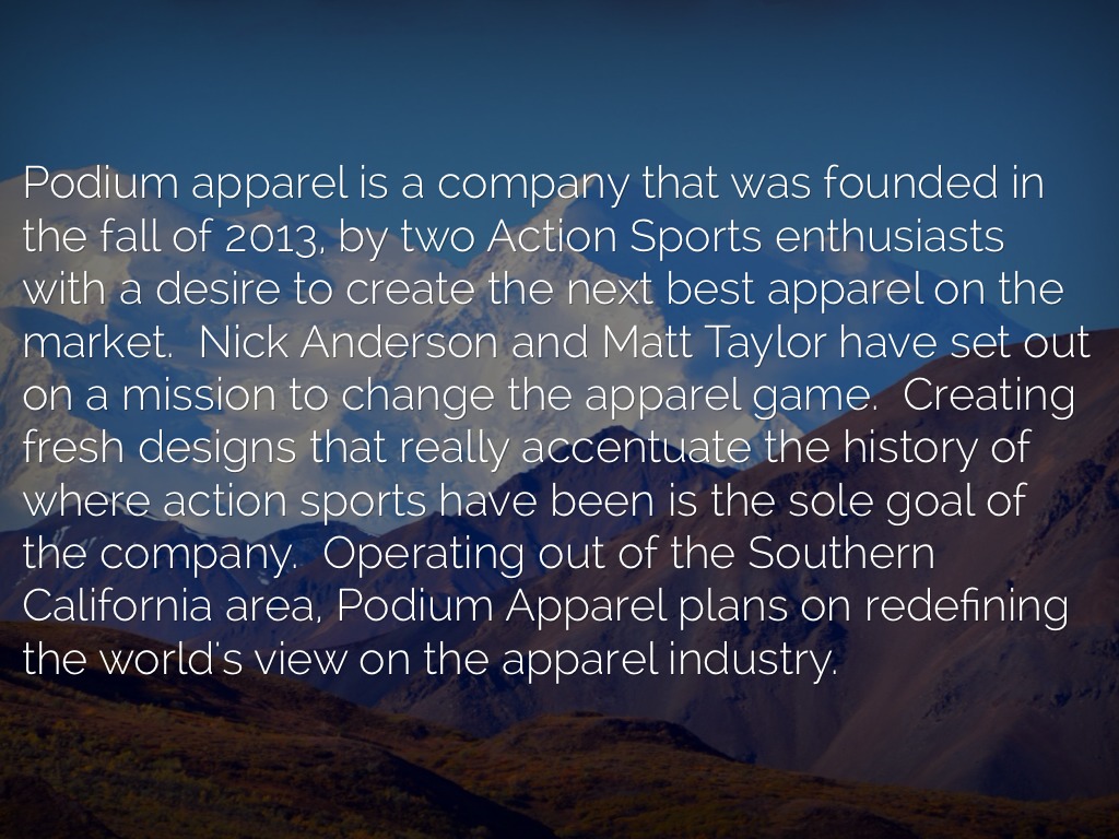 Podium apparel is a company that was founded in the fall of 2013, by two Action Sports enthusiasts with a desire to create the next best apparel on the market. Nick Anderson and Matt Taylor have set out on a mission to change the apparel game. Creating fresh designs that really accentuate the history of where action sports have been is the sole goal of the company. Operating out of the Southern California area, Podium Apparel plans on redefining the world's view on the apparel industry.