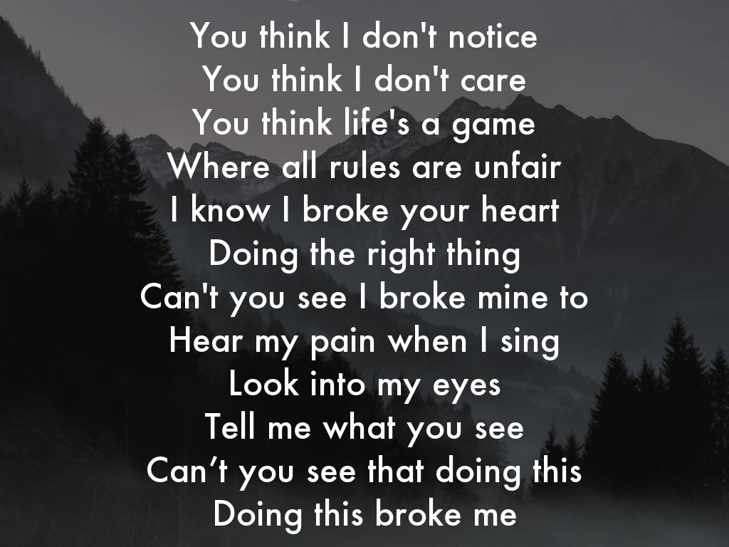 You think I don't notice You think I don't care You think life's a game Where all rules are unfair I know I broke your heart Doing the right thing Can't you see I broke mine to Hear my pain when I sing Look into my eyes Tell me what you see Can’t you see that doing this Doing this broke me