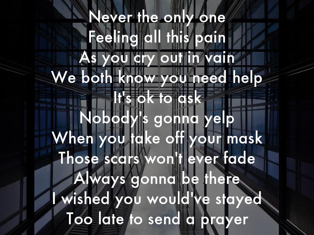 Never the only one Feeling all this pain As you cry out in vain We both know you need help It's ok to ask Nobody's gonna yelp When you take off your mask Those scars won't ever fade Always gonna be there I wished you would've stayed Too late to send a prayer