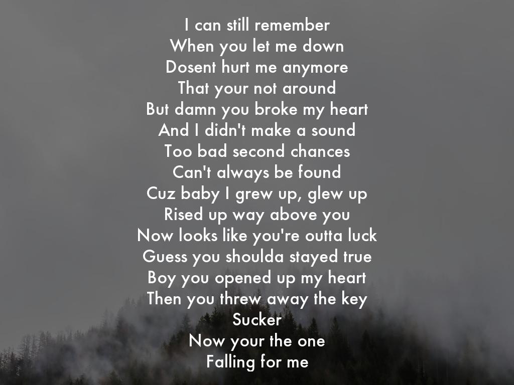 I can still remember When you let me down Dosent hurt me anymore That your not around But damn you broke my heart And I didn't make a sound Too bad second chances Can't always be found Cuz baby I grew up, glew up Rised up way above you Now looks like you're outta luck Guess you shoulda stayed true Boy you opened up my heart Then you threw away the key Sucker Now your the one Falling for me