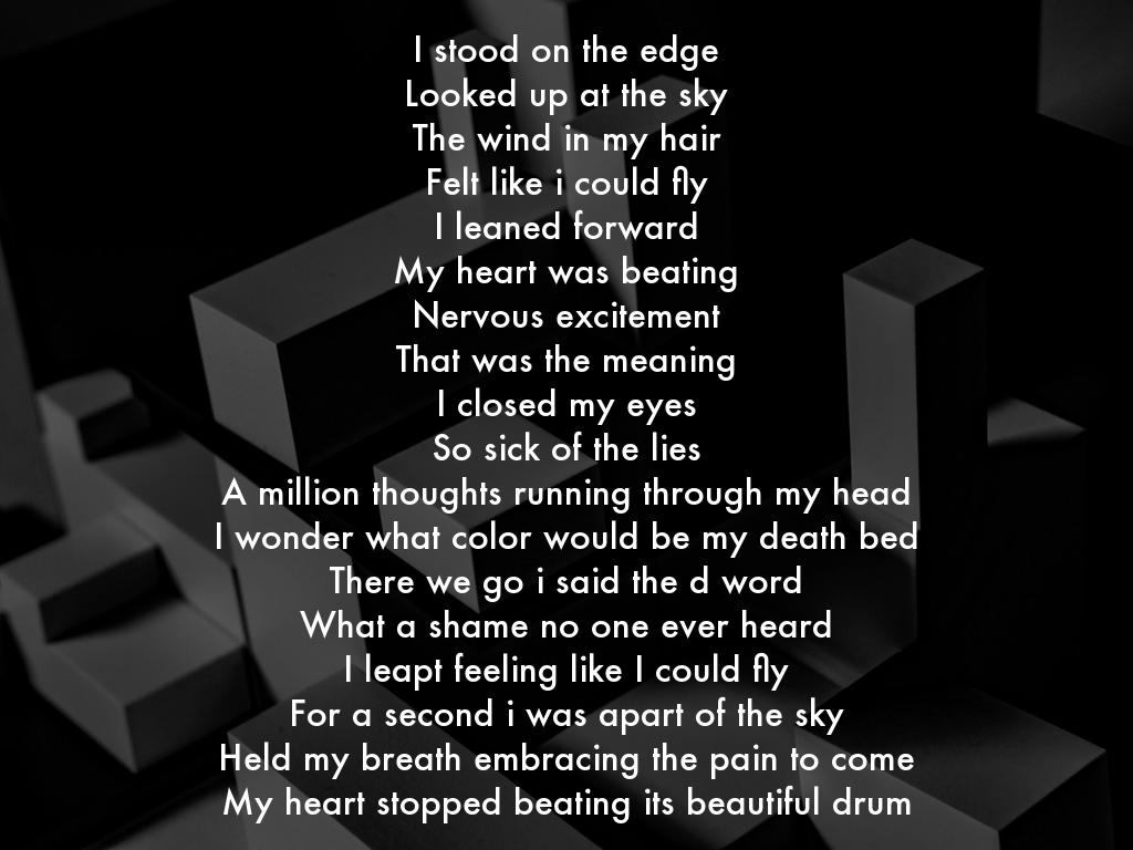 I stood on the edge Looked up at the sky The wind in my hair Felt like i could fly I leaned forward My heart was beating Nervous excitement That was the meaning I closed my eyes So sick of the lies A million thoughts running through my head I wonder what color would be my death bed There we go i said the d word What a shame no one ever heard I leapt feeling like I could fly For a second i was apart of the sky Held my breath embracing the pain to come My heart stopped beating its beautiful drum