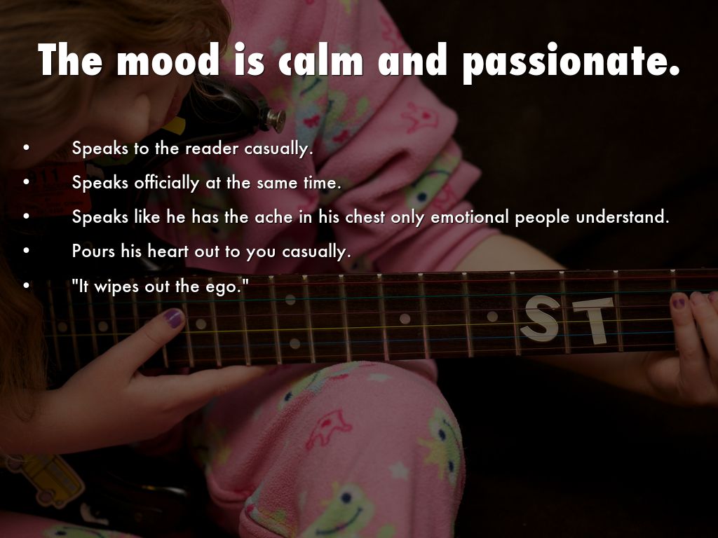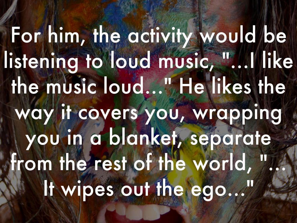 For him, the activity would be listening to loud music, "...I like the music loud..." He likes the way it covers you, wrapping you in a blanket, separate from the rest of the world, "... It wipes out the ego..."