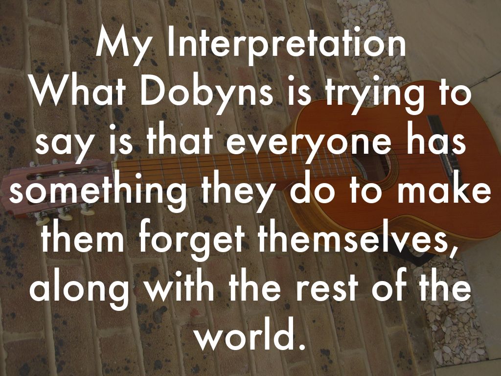 My Interpretation What Dobyns is trying to say is that everyone has something they do to make them forget themselves, along with the rest of the world.