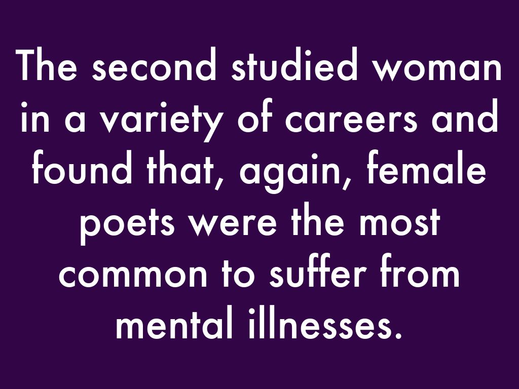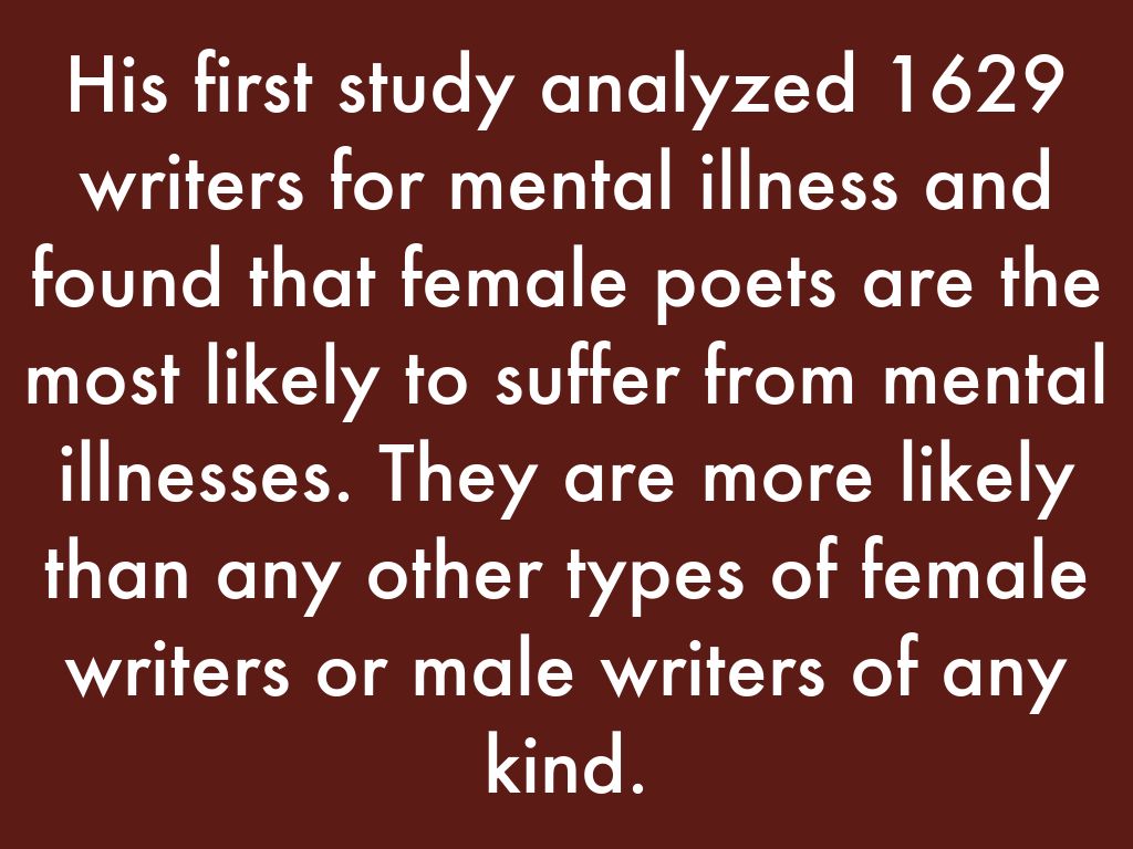 His first study analyzed 1629 writers for mental illness and found that female poets are the most likely to suffer from mental illnesses. They are more likely than any other types of female writers or male writers of any kind.