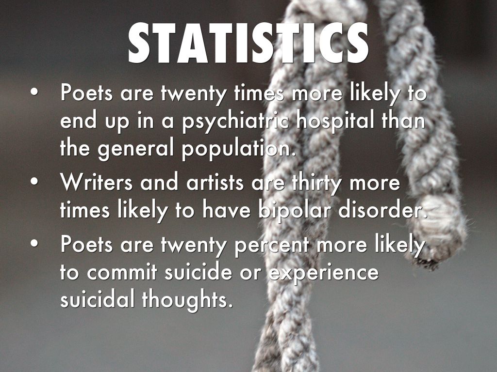 Psychiatrist Kay Redfield Jamison found that poets are thirty times more likely to suffer from some form of depressive illness. These poets are also more at risk for suicide or suicidal thoughts.