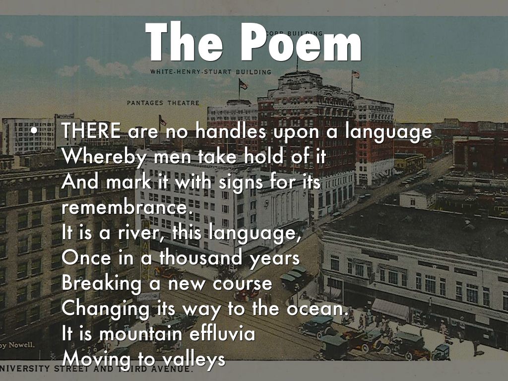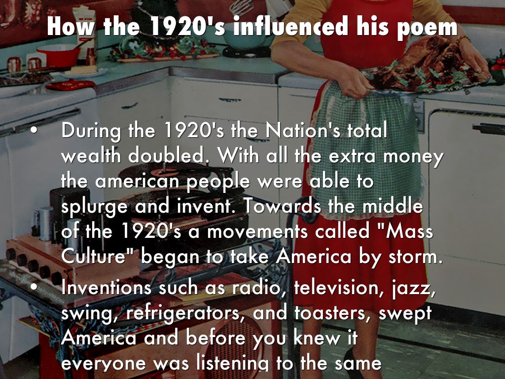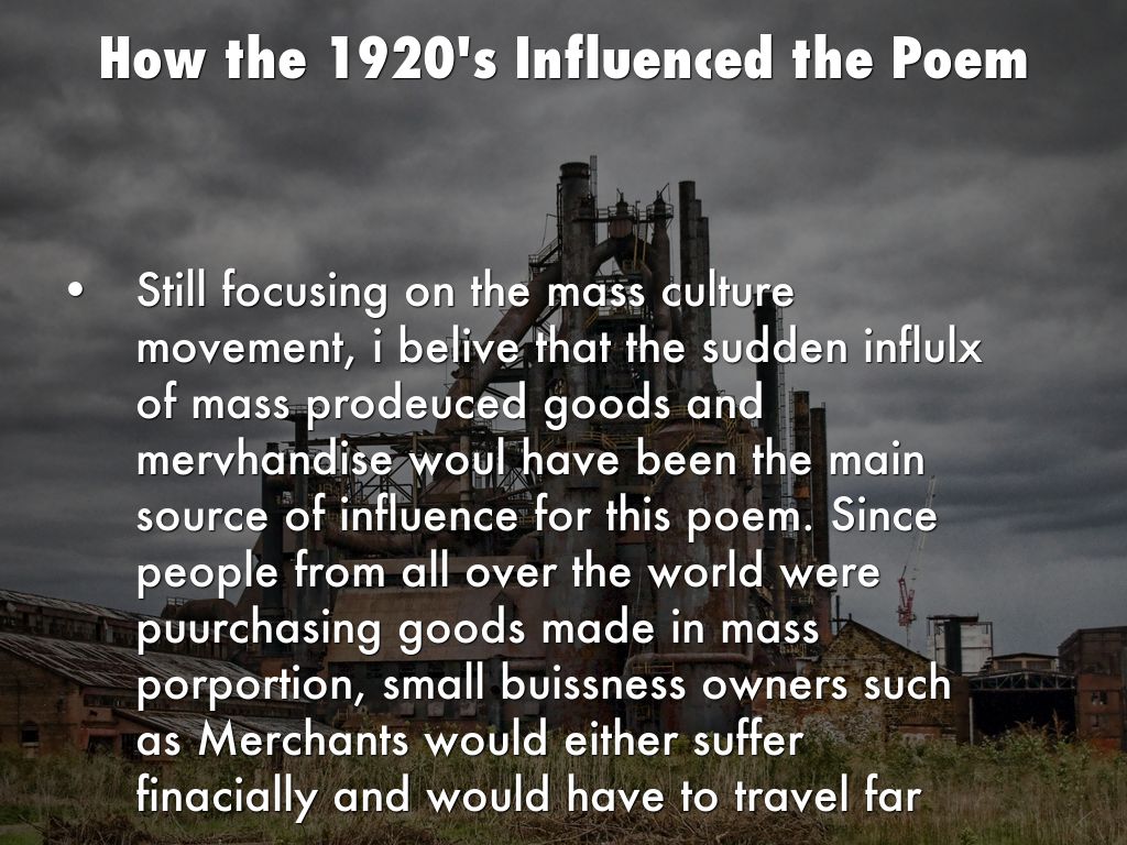 Still focusing on the mass culture movement, i belive that the sudden influlx of mass prodeuced goods and mervhandise woul have been the main source of influence for this poem. Since people from all over the world were puurchasing goods made in mass porportion, small buissness owners such as Merchants would either suffer finacially and would have to travel far and wide to make sales or they would get caught up in the selling of mass produced goods.