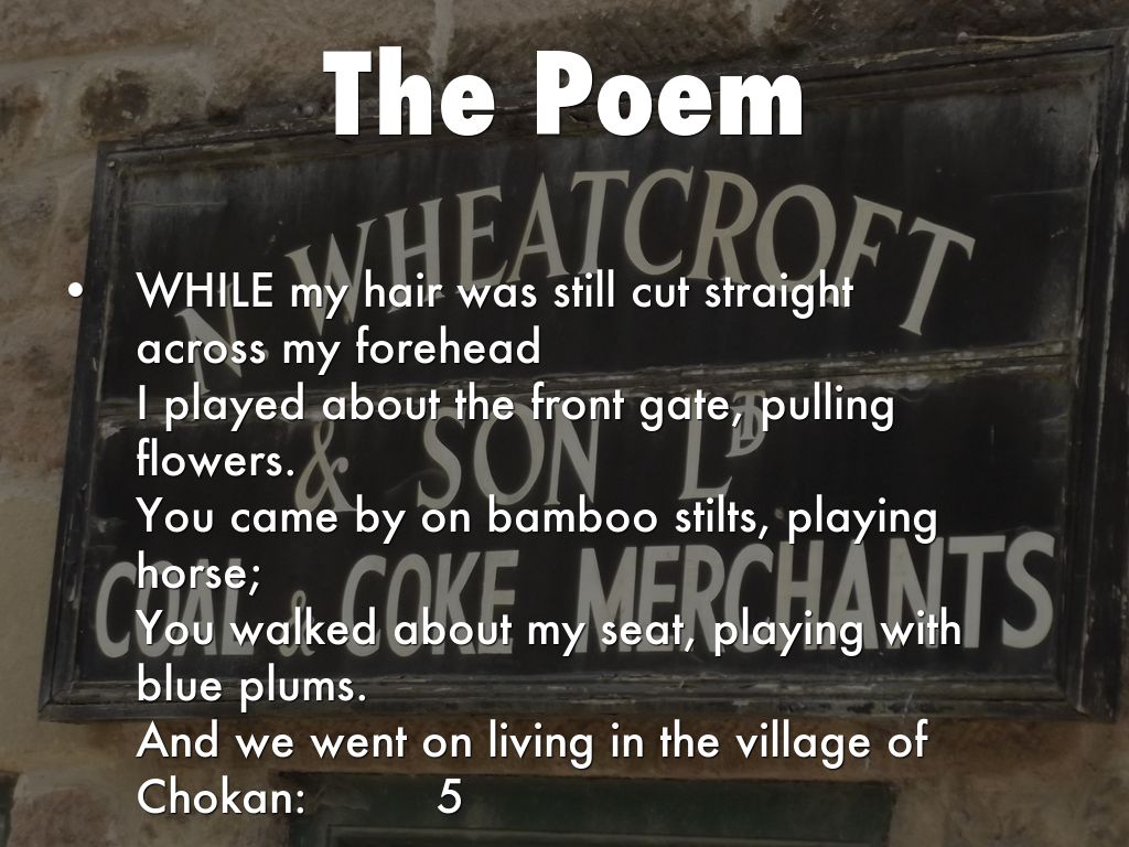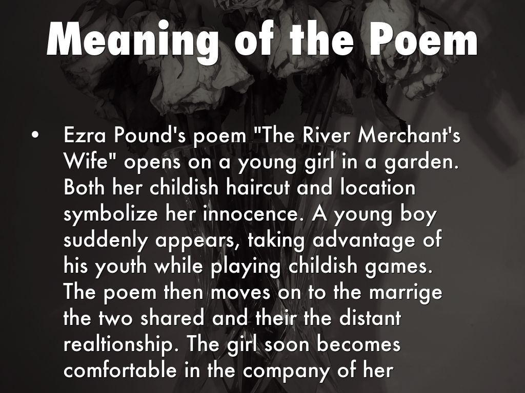 Ezra Pound's poem "The River Merchant's Wife" opens on a young girl in a garden. Both her childish haircut and location symbolize her innocence. A young boy suddenly appears, taking advantage of his youth while playing childish games. The poem then moves on to the marrige the two shared and their the distant realtionship. The girl soon becomes comfortable in the company of her husband, only to have him leave and not return due to his job as a merchant.