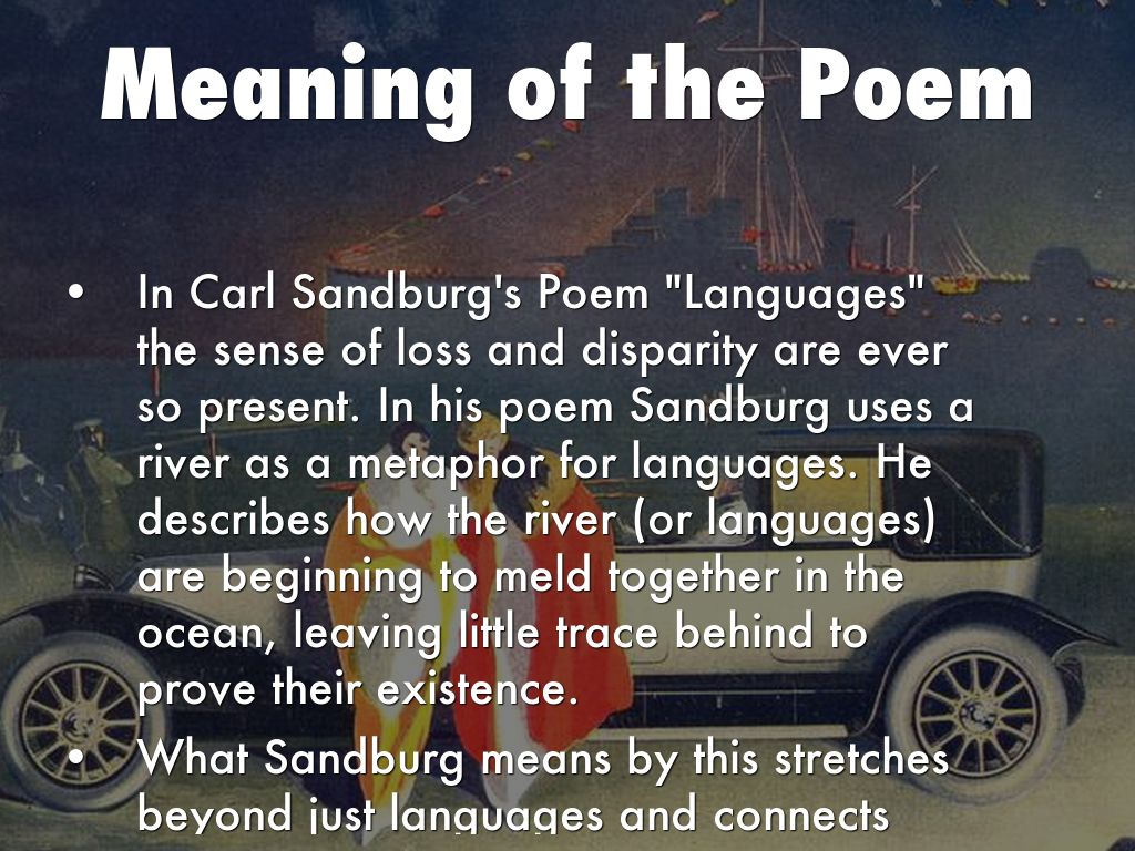 In Carl Sandburg's Poem "Languages" the sense of loss and disparity are ever so present. In his poem Sandburg uses a river as a metaphor for languages. He describes how the river (or languages) are beginning to meld together in the ocean, leaving little trace behind to prove their existence.
