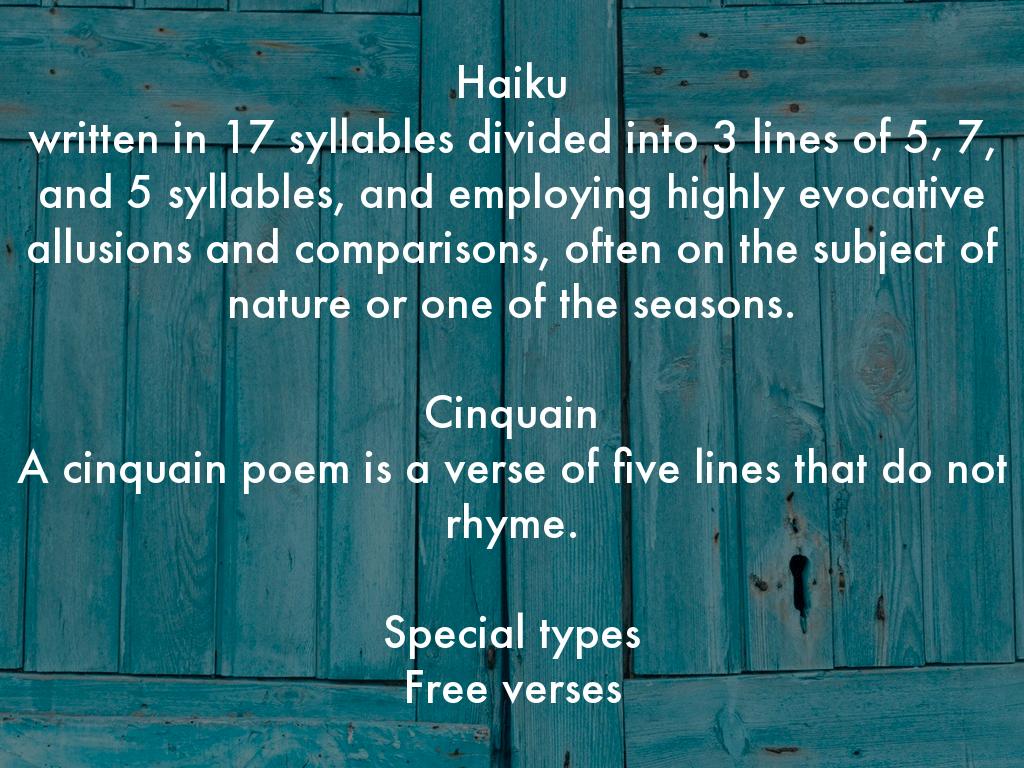 Cinquain A cinquain poem is a verse of five lines that do not rhyme.