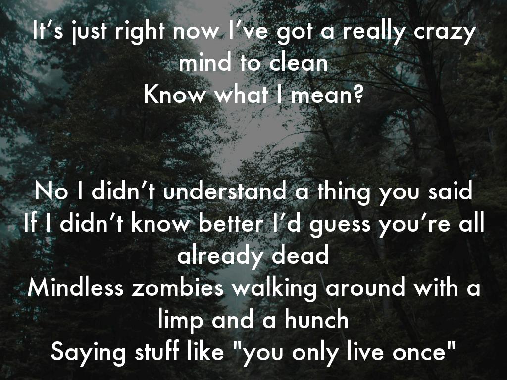 No I didn’t understand a thing you said If I didn’t know better I’d guess you’re all already dead Mindless zombies walking around with a limp and a hunch Saying stuff like "you only live once"