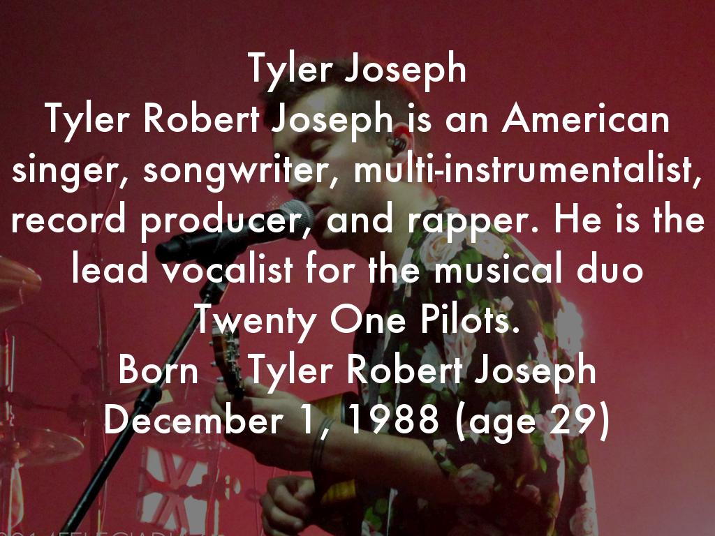 Tyler Joseph Tyler Robert Joseph is an American singer, songwriter, multi-instrumentalist, record producer, and rapper. He is the lead vocalist for the musical duo Twenty One Pilots. Born Tyler Robert Joseph December 1, 1988 (age 29)