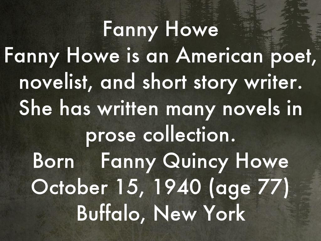 Fanny Howe Fanny Howe is an American poet, novelist, and short story writer. She has written many novels in prose collection. Born Fanny Quincy Howe October 15, 1940 (age 77) Buffalo, New York