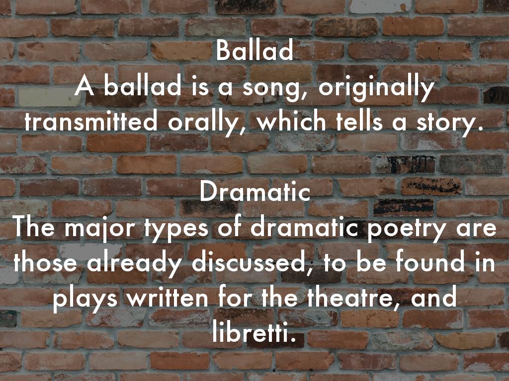 Narrative Narrative poetry gives a verbal representation, in verse, of a sequence of connected events, it propels characters through a plot. It is always told by a narrator. Narrative poems might tell of a love story, the story of a father and son or the deeds of a hero or heroine