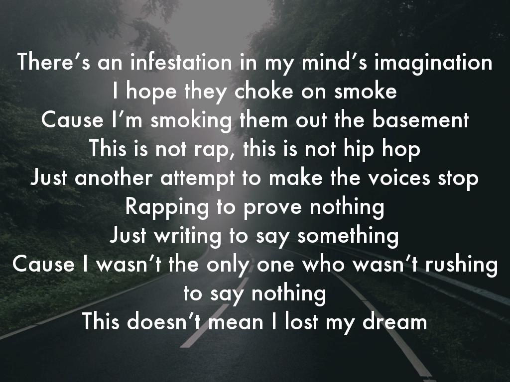 There’s an infestation in my mind’s imagination I hope they choke on smoke Cause I’m smoking them out the basement This is not rap, this is not hip hop Just another attempt to make the voices stop Rapping to prove nothing Just writing to say something Cause I wasn’t the only one who wasn’t rushing to say nothing This doesn’t mean I lost my dream