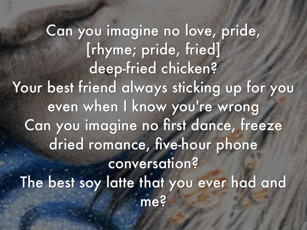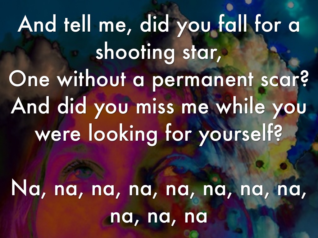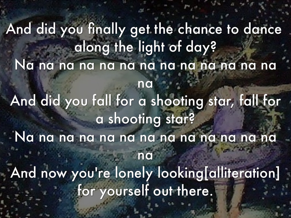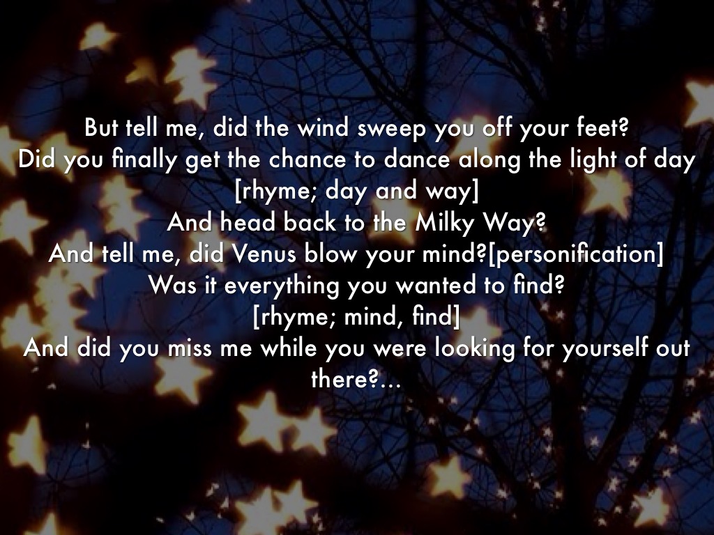 The song uses several examples of figurative language. The most obvious is metaphor. The clear meaning is that the woman has returned from a trip somewhere on earth, which he is comparing to a trip to space. He uses “drops of Jupiter” to begin this metaphor, and continues with metaphors of “stay on the moon” and “tracing her way through the constellation”. The song also uses simile comparing the way the women appears after the trip. The singer uses light images to describe beautiful things “she acts like summer and walks like rain.” He also uses personification when he asks the women if she fell “for a shooting star/one without a permanent scar” in a tragic metaphor.