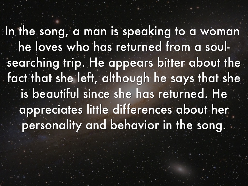 In the song, a man is speaking to a woman he loves who has returned from a soul-searching trip. He appears bitter about the fact that she left, although he says that she is beautiful since she has returned. He appreciates little differences about her personality and behavior in the song.
