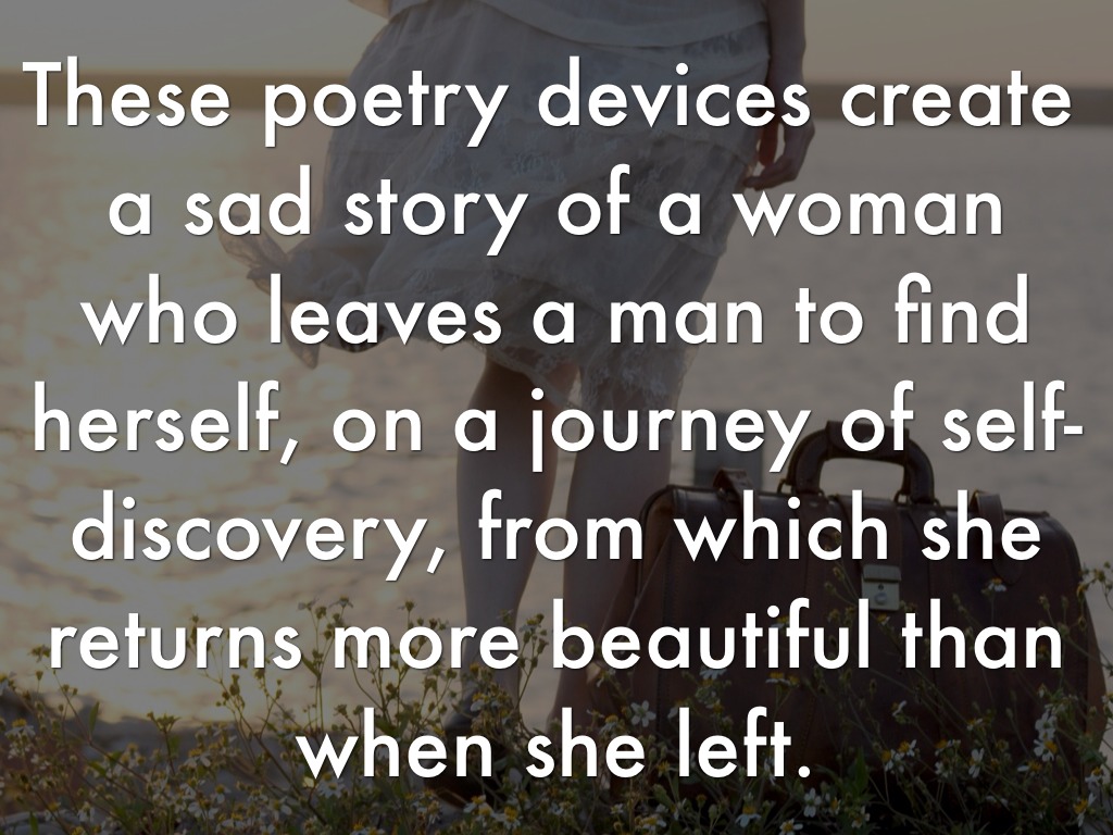 These poetry devices create a sad story of a woman who leaves a man to find herself, on a journey of self-discovery, from which she returns more beautiful than when she left.