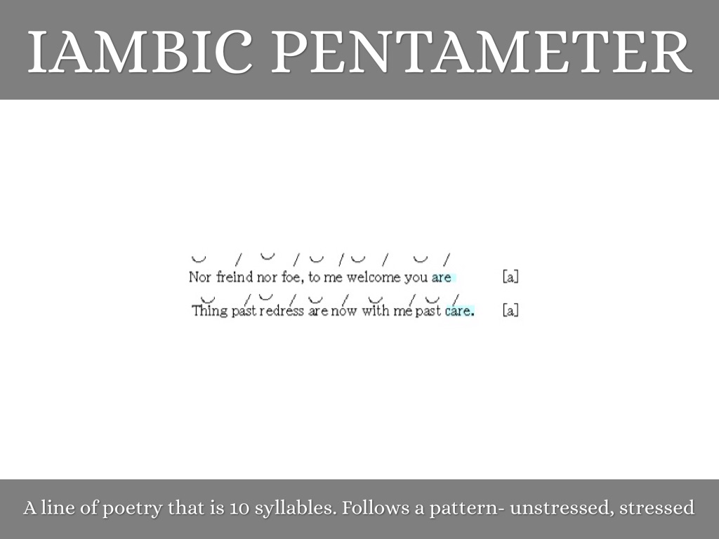 A line of poetry that is 10 syllables. Follows a pattern- unstressed, stressed