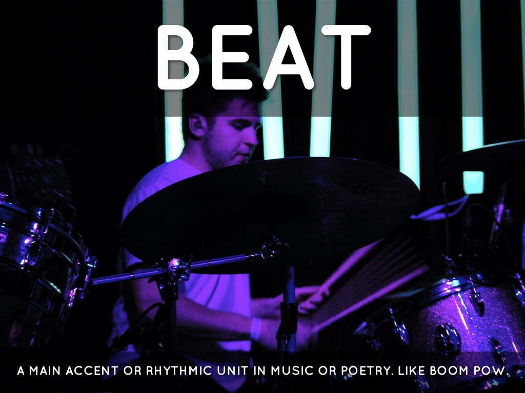 A MAIN ACCENT OR RHYTHMIC UNIT IN MUSIC OR POETRY. LIKE BOOM POW.
