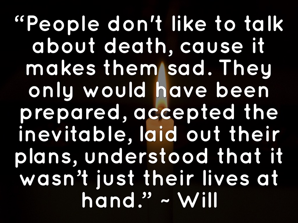 “People don't like to talk about death, cause it makes them sad. They only would have been prepared, accepted the inevitable, laid out their plans, understood that it wasn’t just their lives at hand.” ~ Will