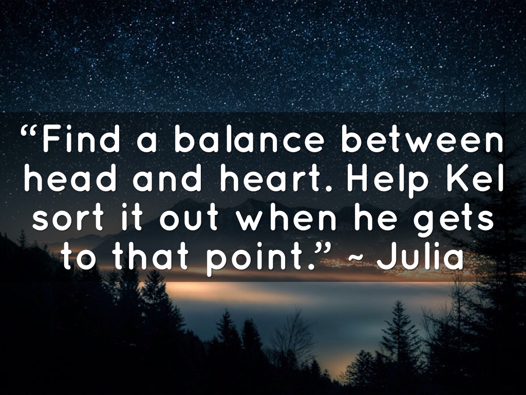 “Find a balance between head and heart. Help Kel sort it out when he gets to that point.” ~ Julia