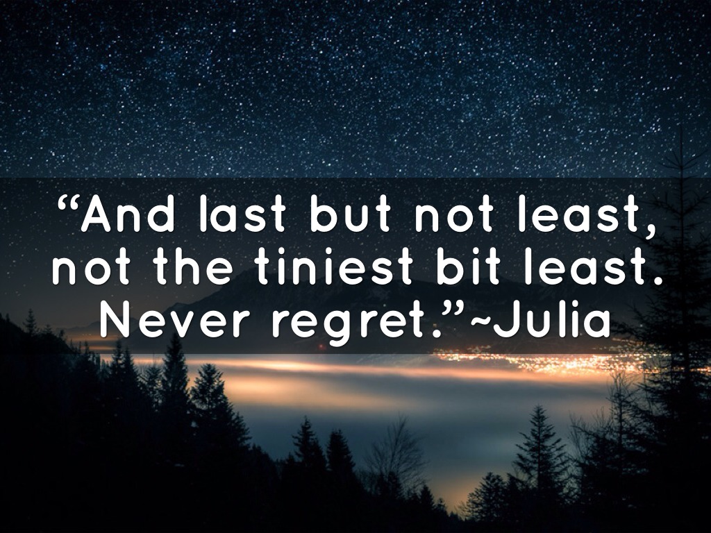 “And last but not least, not the tiniest bit least. Never regret.”~Julia