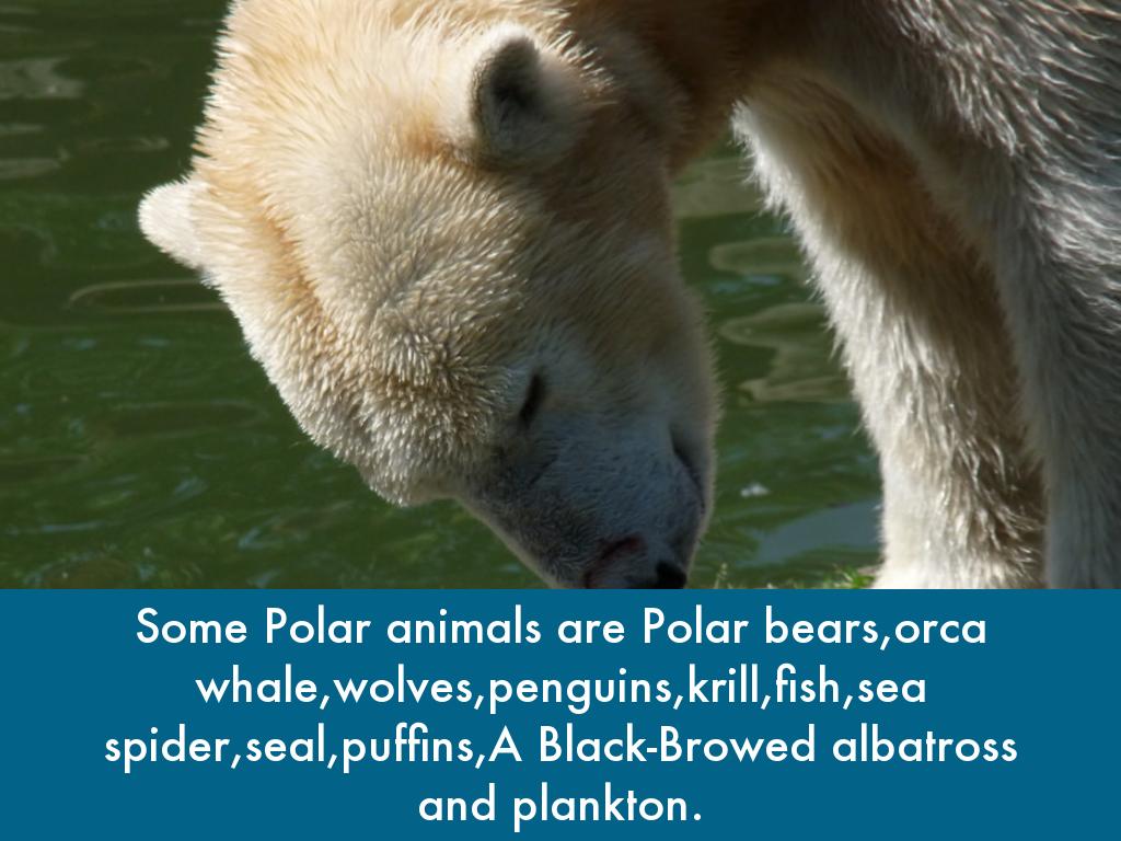 Some Polar animals are Polar bears,orca whale,wolves,penguins,krill,fish,sea spider,seal,puffins,A Black-Browed albatross and plankton.