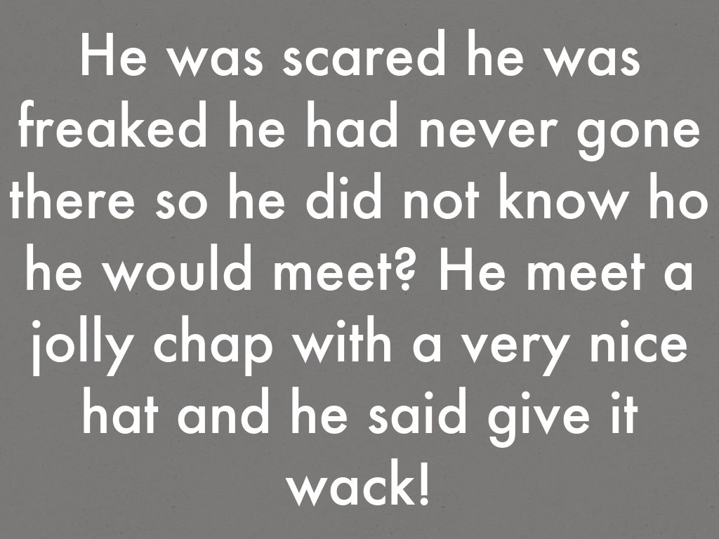 He was scared he was freaked he had never gone there so he did not know ho he would meet? He meet a jolly chap with a very nice hat and he said give it wack!