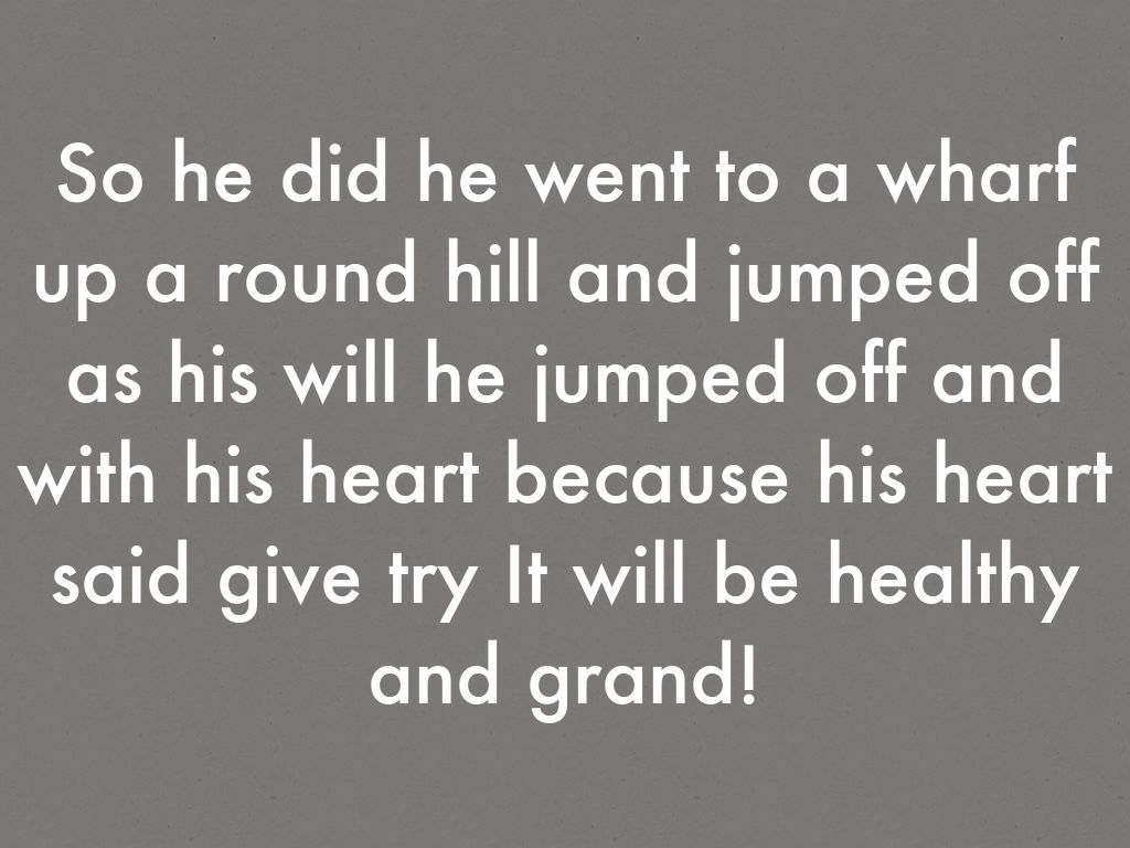 So he did he went to a wharf up a round hill and jumped off as his will he jumped off and with his heart because his heart said give try It will be healthy