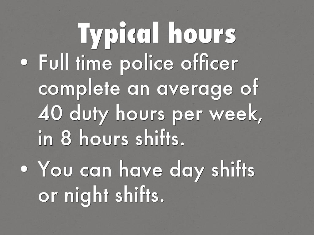 Full time police officer complete an average of 40 duty hours per week, in 8 hours shifts.