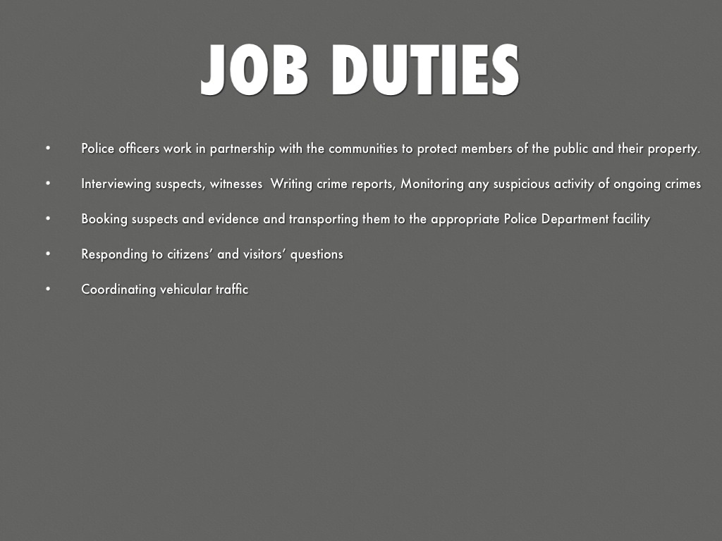 Interviewing suspects, witnesses Writing crime reports, Monitoring any suspicious activity of ongoing crimes