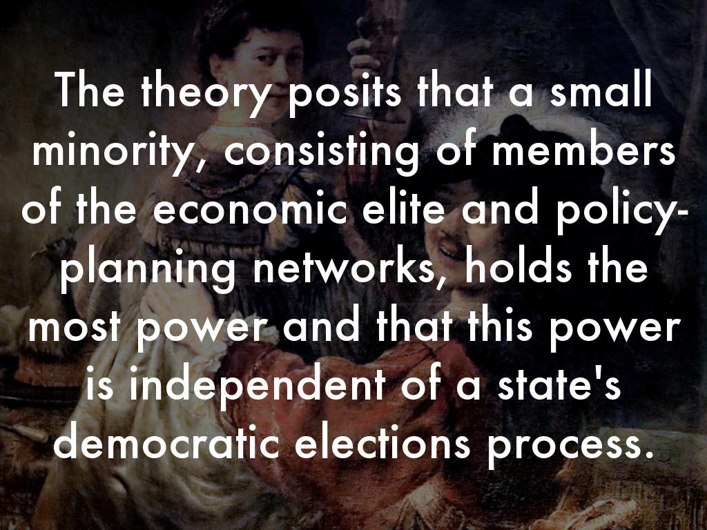 The theory posits that a small minority, consisting of members of the economic elite and policy-planning networks, holds the most power and that this power is independent of a state's democratic elections process.