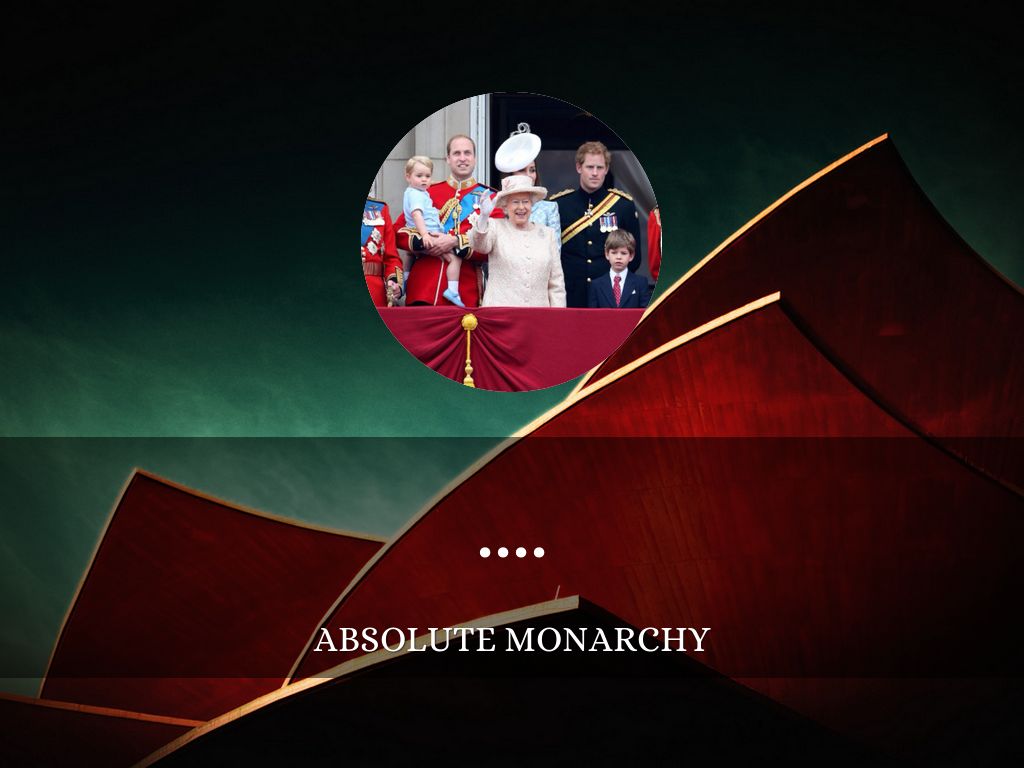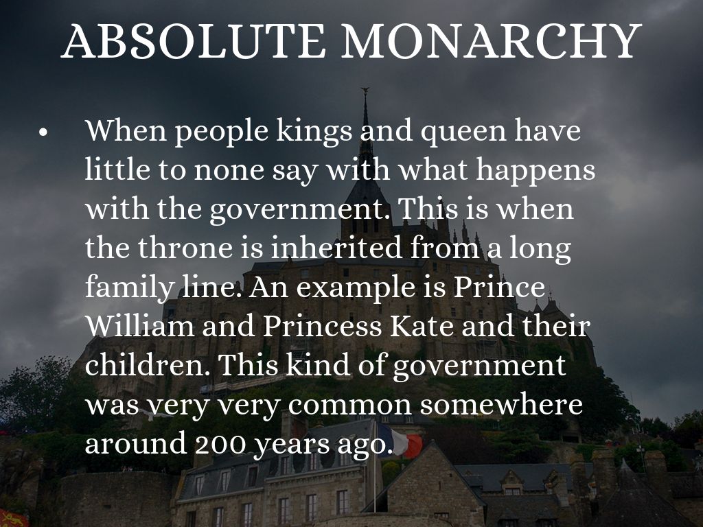 When people kings and queen have little to no say with what happens in the government. Normally throne is inherited from generations of the family be royalty. A form of this is... Prince William and Princess Kate and their children, Queen Elizabeth.This kind of government was very very common somewhere around 200 years ago, and there is some country's that still have it.