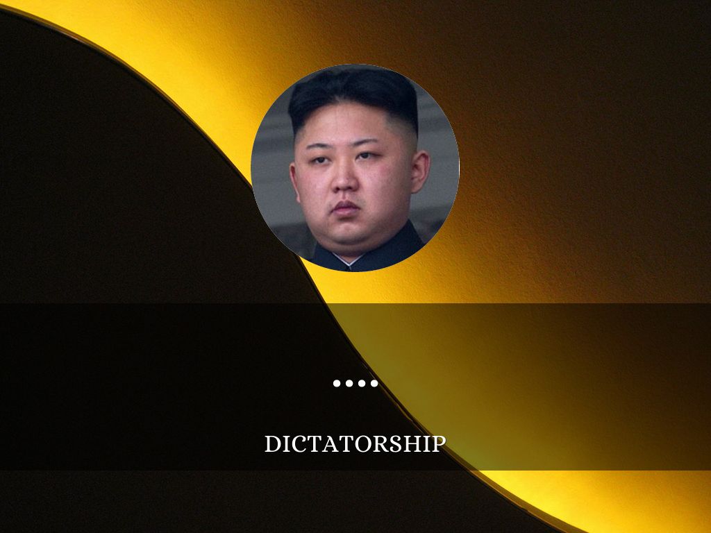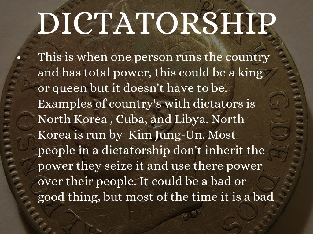 This is when one person runs the country and has total power, this could be a king or queen but it doesn't have to be. Examples of country's with dictators is North Korea , Cuba, and Libya. North Korea is run by Kim Jung-Un. Most people in a dictatorship don't inherit the power they seize it and use there power over their people. It could be a bad or good thing, but most of the time it is a bad thing, because violate might be encouraged.