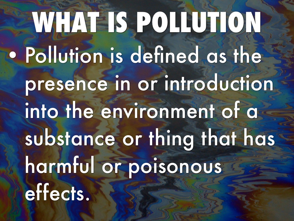 Pollution can occur in many ways but the largest manufacturer of it is humans. Do to the constant expansion and industrialization of society we destroy our natural recourses and our environment.