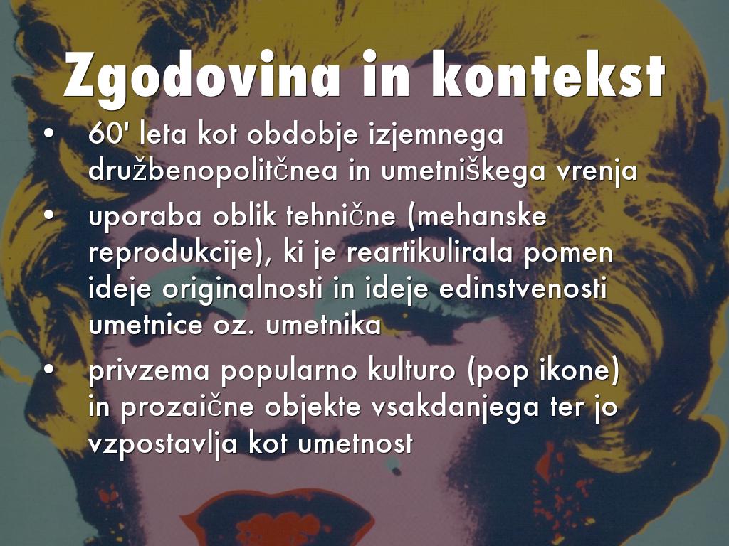 privzema popularno kulturo (pop ikone) in prozaične objekte vsakdanjega ter jo vzpostavlja kot umetnost