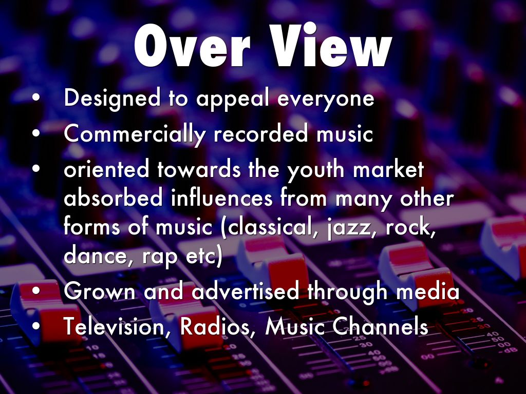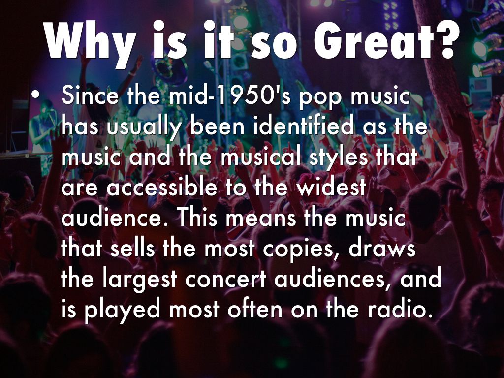 Since the mid-1950's pop music has usually been identified as the music and the musical styles that are accessible to the widest audience. This means the music that sells the most copies, draws the largest concert audiences, and is played most often on the radio.