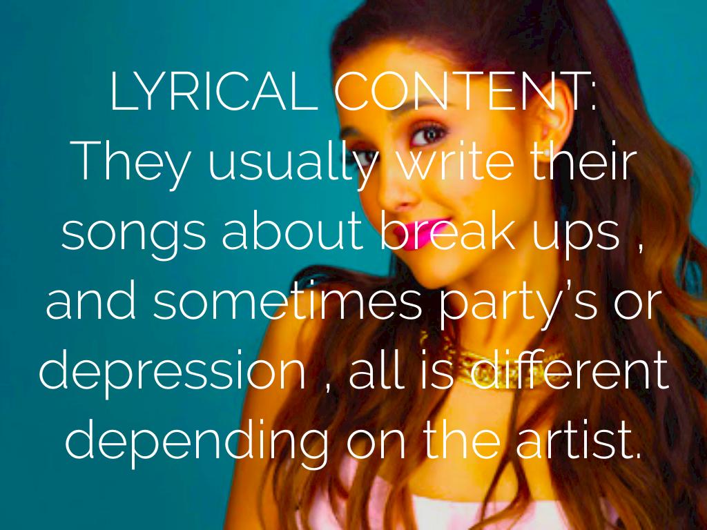 They usually write their songs about break ups , and sometimes party’s or depression , all is different depending on the artist.