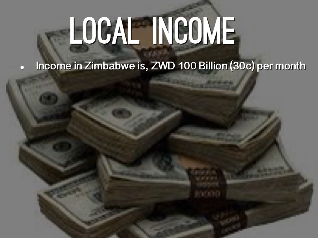• Income in Zimbabwe is, ZWD 100 Billion (30c) per month