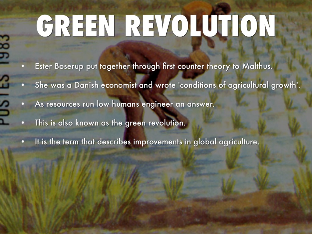 • Ester Boserup put together through first counter theory to Malthus.
