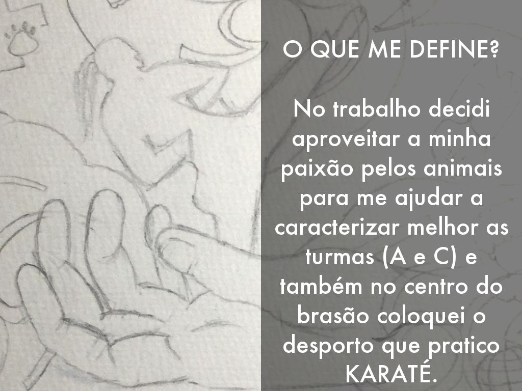 No trabalho decidi aproveitar a minha paixão pelos animais para me ajudar a caracterizar melhor as turmas (A e C) e também no centro do brasão coloquei o desporto que pratico KARATÉ.
