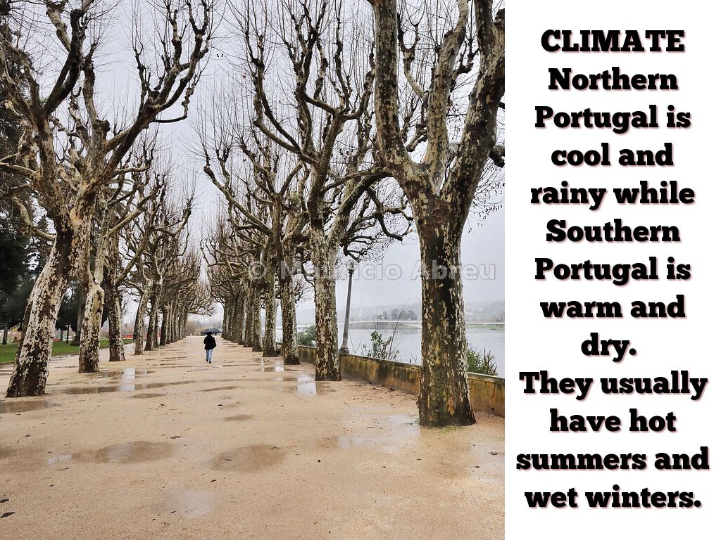 Northern Portugal is cool and rainy while Southern Portugal is warm and dry.