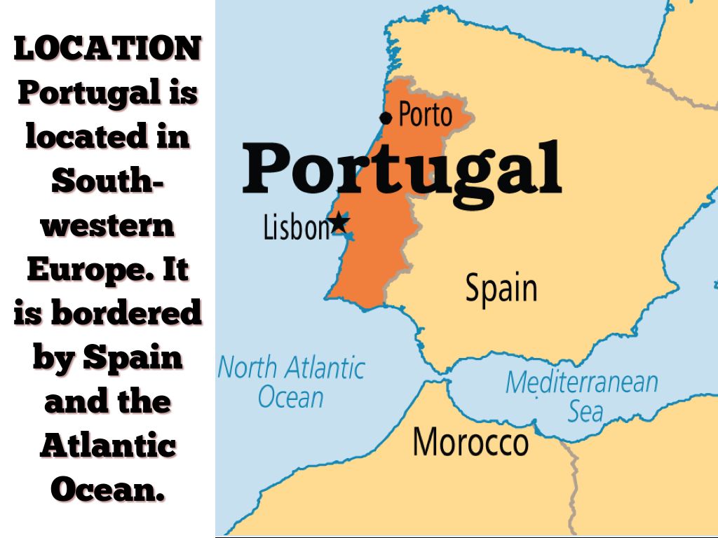 Portugal is located in South-western Europe. It is bordered by Spain and the Atlantic Ocean.